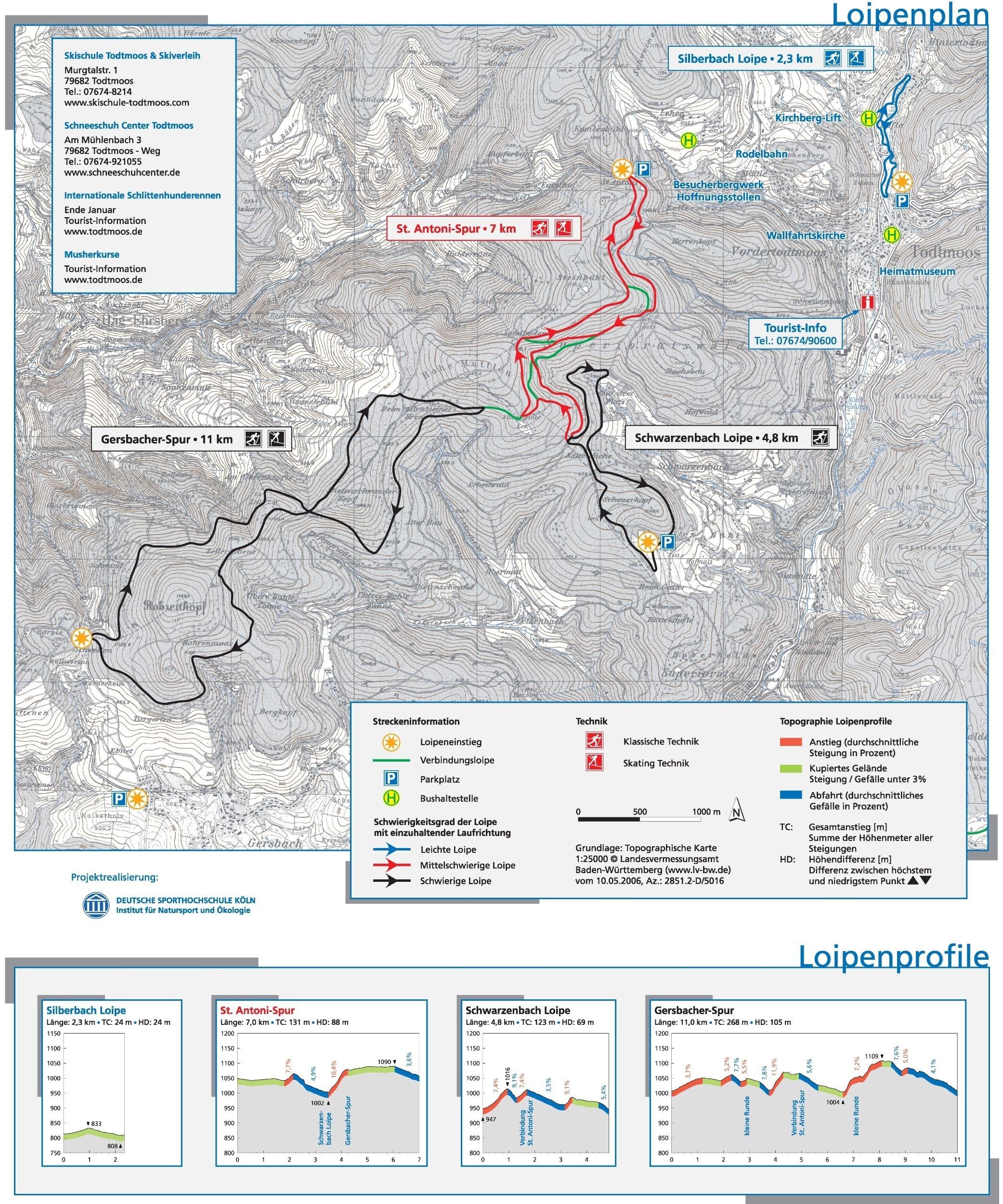 Das Langlaufzentrum Todtmoos-Gersbach bietet Ihnen insgesamt rund 25 Loipenkilometer. Unter den Strecken dominieren Loipen mittelschweren und schweren Niveaus. Doch auch Einsteiger finden mit der Silberbach Loipe (2,3 km) in Vordertodtmoos ein geeignetes Terrain für die ersten Runden. Mit 11 km die längste und gleichzeitig schwerste Strecke ist die Gersbacher-Spur. Ab der Wintersaison 2017 wird zusätzlich erstmalig vom Loipenzentrum in Bernau bis nach Todtmoos gespurt, sodass ca. 7,5 km zum Loipennetz hinzukommen.
